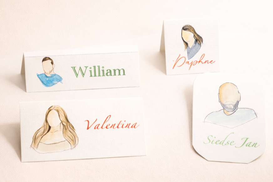 Handgemalte Hochzeitseinladungen, Platzkarten, Aquarell-Gästeporträts und einzigartige Gästebuch-Kunst.
