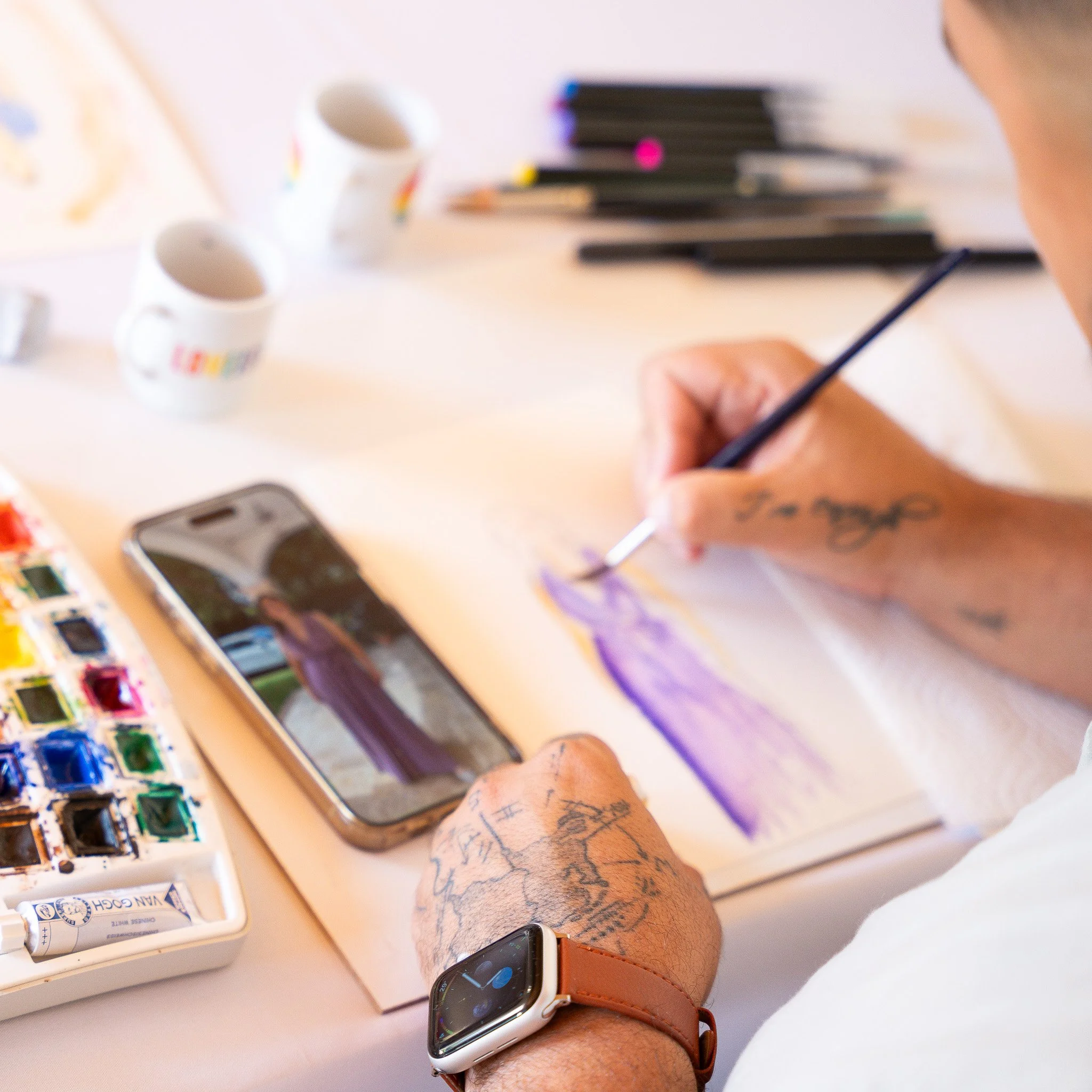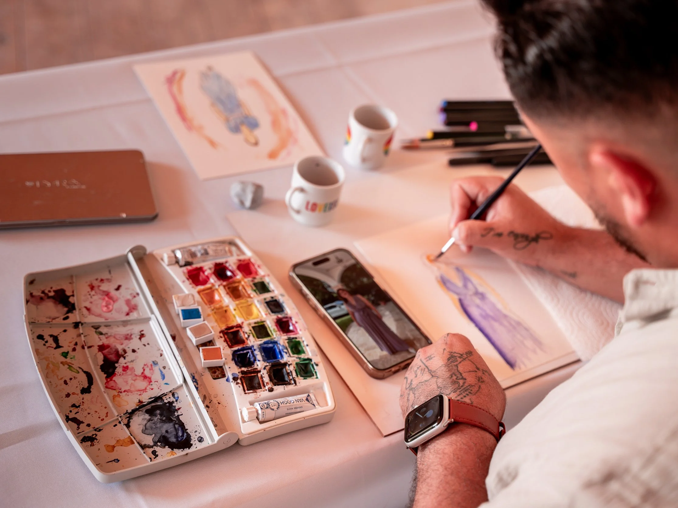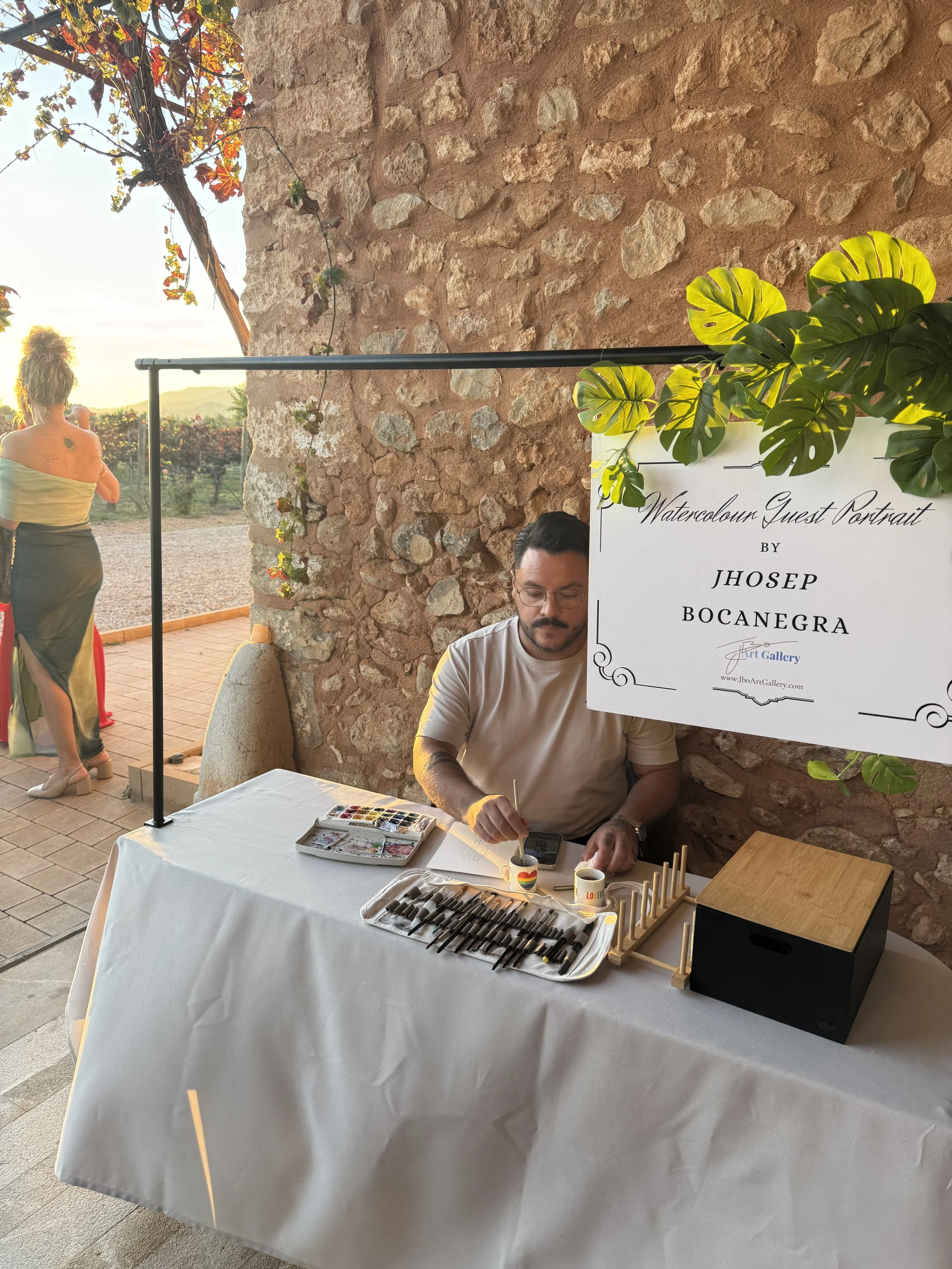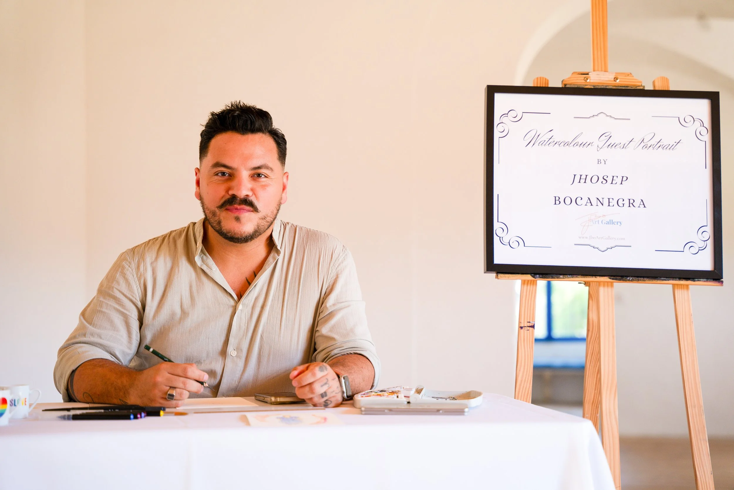 Soy Jhosep, nacido en Colombia, criado en los Países Bajos y establecido en Mallorca desde 2007. El arte ha formado parte de mi vida desde que tengo memoria. Lo que comenzó con horas dibujando cuando era niño se convirtió con el tiempo en mi camino profesional como pintor en vivo para bodas en Mallorca, creando retratos en acuarela elegantes que capturan la esencia de las personas y la atmósfera especial de cada celebración.
