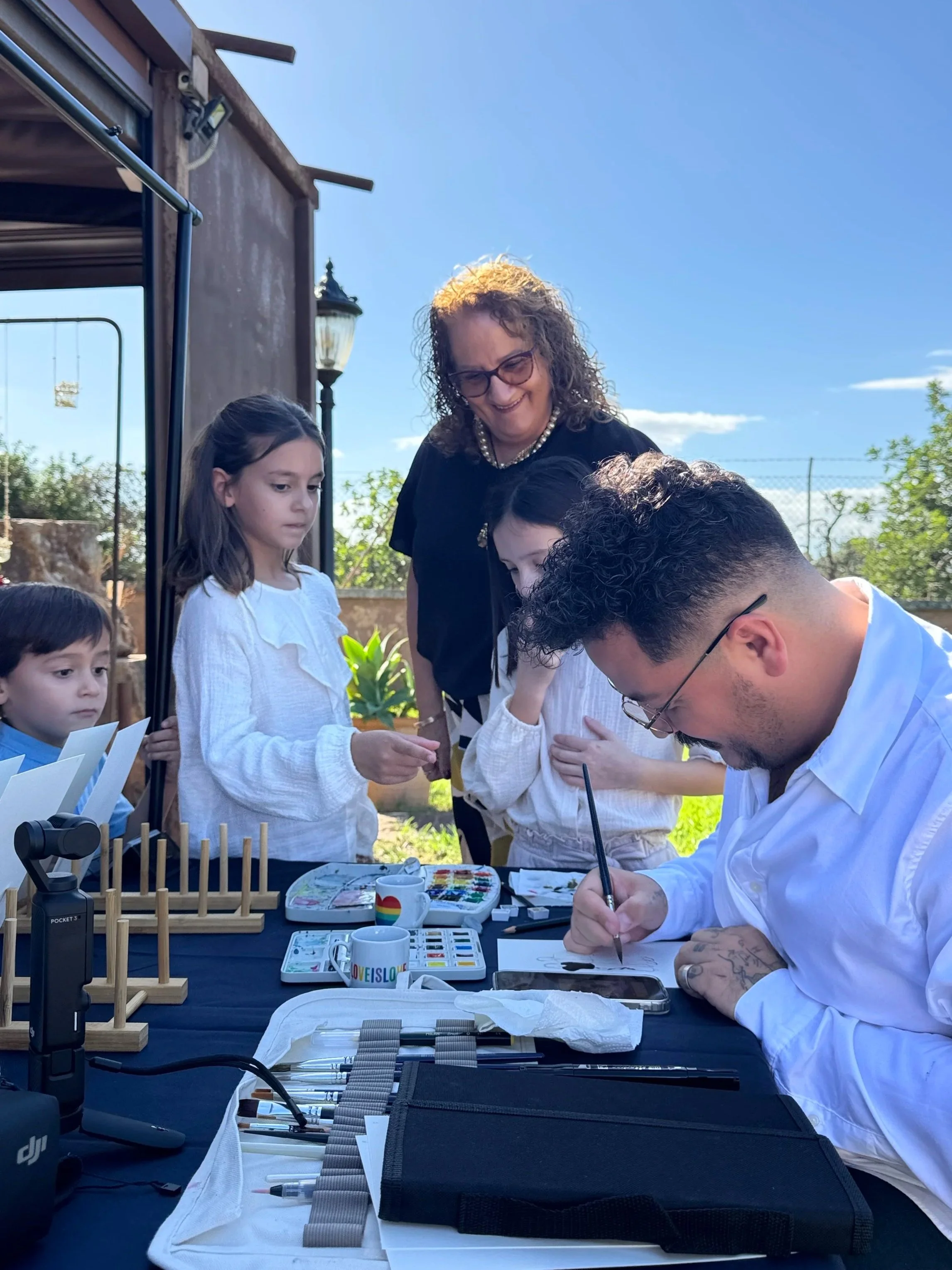 Entiendo que una boda es un momento profundamente personal y lleno de significado. Por eso mi objetivo no es solo pintar retratos, sino también aportar una experiencia artística que forme parte natural de vuestra celebración. Mientras los retratos cobran vida, los invitados disfrutan del proceso y se llevan a casa un recuerdo único y personal de vuestra boda en Mallorca, una pequeña obra de arte que conservarán como recuerdo de ese día especial.